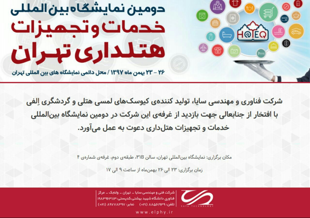 دومین نمایشگاه بین‌المللی خدمات و تجهیزات هتل‌داری تهران در تاریخ ۲۳ بهمن‌ماه در محل دائمی نمایشگاه‌های بین‌المللی تهران افتتاح می‌شود و شرکت سایا از تمامی هتل‌داران، صاحبان مراکز گردشگری و توریستی و همچنین از کلیه‌ی علاقه‌مندان جهت بازدید از نمایشگاه و غرفه‌ی شرکت سایا دعوت به عمل می‌آورد.