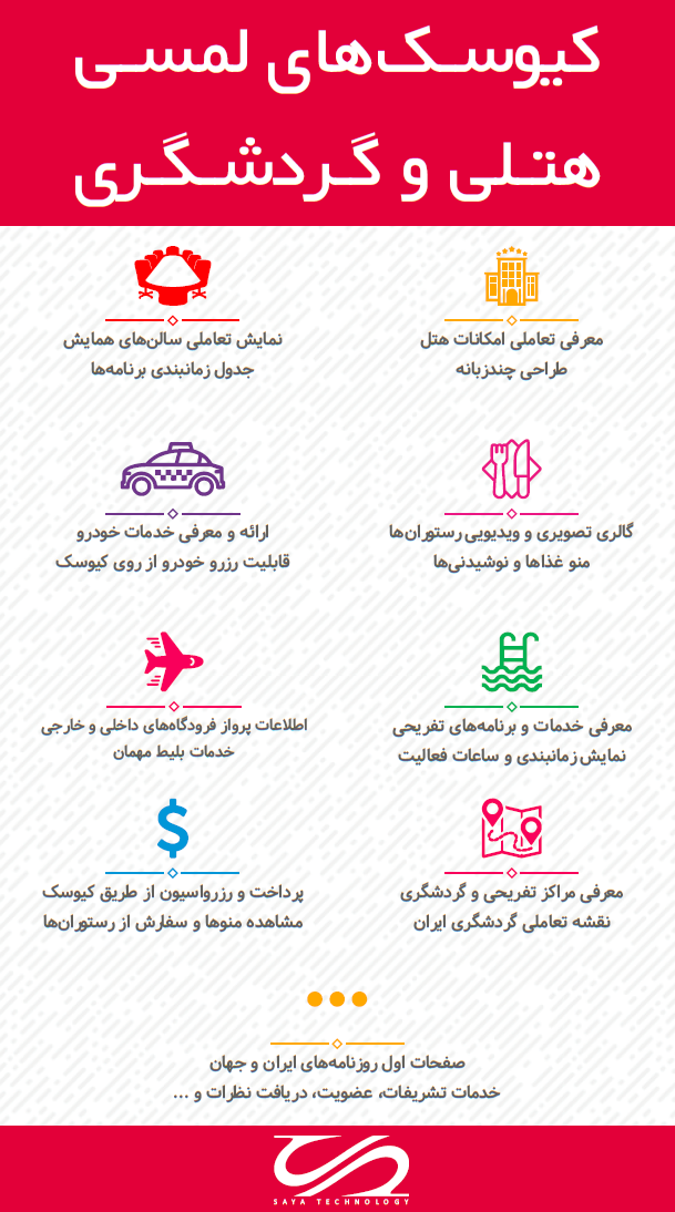 معرفی امکانات هتل و همچنین ارائه خدمات به مهمانان به شیوه‌ای مدرن، زیبا و ساده از اهداف اصلی کیوسک‌ لمسی هتلی می‌باشد. این برنامه به گونه‌ای طراحی شده است که بار مراجعات مهمانان به میز رسپشن را کاهش داده و نیازها و درخواست‌های مورد نظر مهمانان را تا حد امکان پاسخ می‌دهد. برنامه‌ی کیوسک لمسی هتلی با ترکیبی از معرفی امکانات هتل، ارائه اطلاعات توریستی، شهری و فرودگاهی، ارائه خدمات خودرو و تاکسی، چاپ بلیط مسافر و قابلیت‌های متنوع دیگر همراه با گرافیکی زیبا و متناسب با محیط هتل شما، به عنوان یک کانسیرج هوشمند چند زبانه پاسخگوی نیاز‌های مهمانان شما خواهد بود. ارائه خدمات ساینیج (signage) برای اجلاس‌ها، همایش‌ها و مراسم شما با سیستم مدیریت مرکزی و محیط کاربری جذاب از قابلیت‌های دیگر این برنامه می‌باشد.