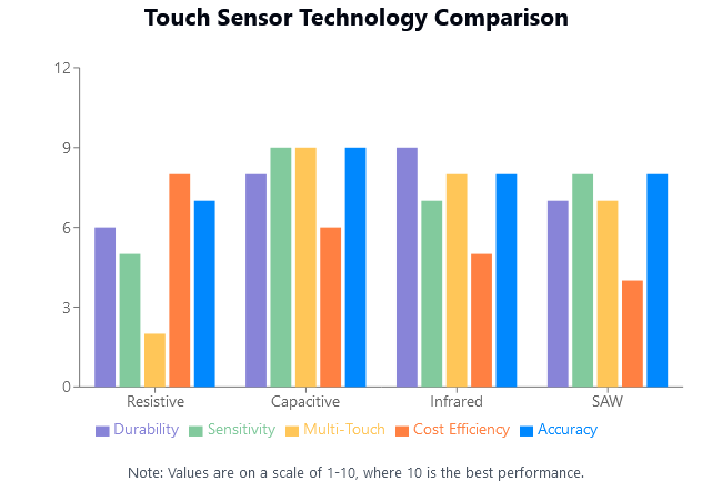 در نمودار زیر چهار سنسور لمسی مورد استفاده در کیوسکهای لمسی توسط هوش مصنوعی مقایسه شده و به هر یک از ویژگیهای آنها امتیاز داده شده است.