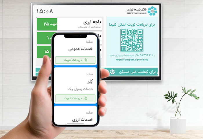 توضیح: این تصویر یک نمایشگر الفی لایو با QR Code برای نوبت دهی را نشان میدهد.