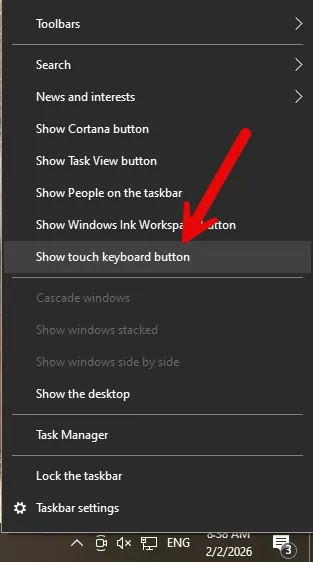 در محیط لمسی کیوسک، لمس سریع معادل کلیک موس، دوبار لمس سریع پشت سر هم معادل دابلکلیک موس و نگهداشتن طولانی لمس معادل کلیک راست موس است. در صورتی نیاز به تایپ، اگر باکسی که میخواهید تایپ نمایید را لمس کنید، کیبورد به صورت خودکار روی نمایشگر آشکار میشود. اگر کیبورد آشکار نشد، مشابه تصویر زیر، با راست کلیک بر روی تسکبار کیبورد مجازی را فعال نمایید و با کلیک و باز کردن آن از این کیبورد برای تایپ استفاده کنید.