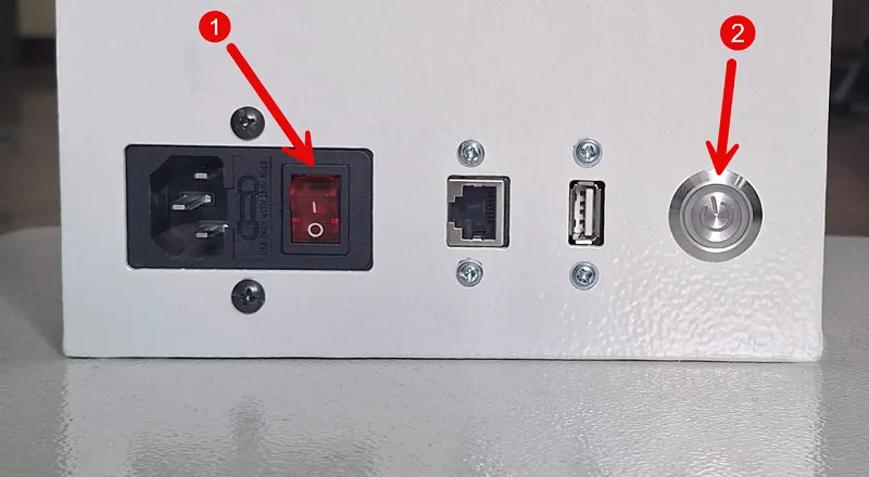 در قسمت پشت و پایین کیوسک کلید قرمز رنگ پاور دستگاه و دکمه استیل فشاری روشن و خاموش کردن دستگاه قرار دارد. کلید قرمز برق کیوسک را قطع و وصل میکند و دکمه استیل فشاری سیستم کیوسک را روشن و یا خاموش میکند. با روشن بودن کلید قرمز کلید، به صورت خودکار حداکثر بعد از ده ثانیه دکمه استیل به رنگ آبی روشن میشود و سیستم عامل نیز بر روی نمایشگر کیوسک حداکثر بعد از ۲۰ ثانیه شروع به بالا آمدن میکند.