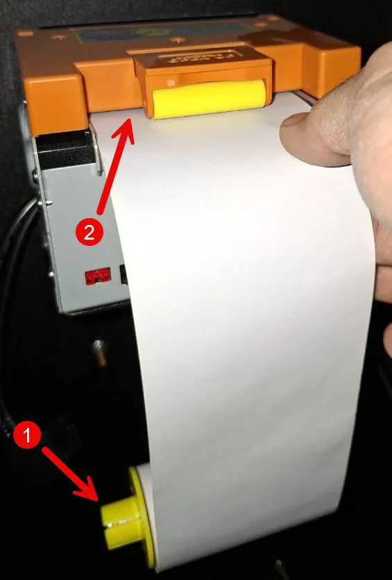 این پرینتر، رول کاغذ هشت سانتیمتری استفاده میکند. درب پشت دستگاه (قسمت مخزن پرینتر) را باز کنید و کاغذ را مشابه تصویر زیر جایگذاری نمایید (رول کاغذ هشت سانتی را از متصدی شعبه دریافت کنید). توجه نمایید با وارد کردن کاغذ در شکاف نشان داده شده (۲)، کاغذ به صورت خودکار کشیده شده و برش میخورد. در ضمن دقت نمایید که درپوش مربوط به رول کاغذ (۱) به درستی جا خورده باشد.