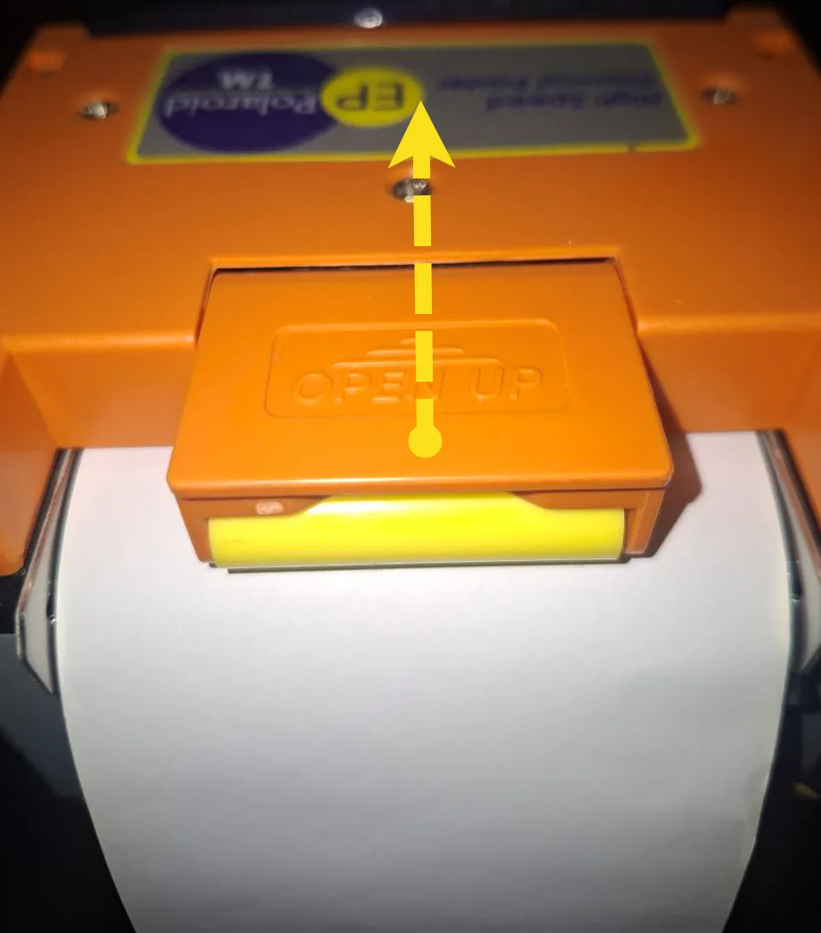 در صورت جمع شدن و یا گیرکردن کاغذ و یا چشمک زدن نوار آبی شکاف پرینتر جلوی دستگاه، دستگیره OPEN UP بالای پرینتر را به بالا کشیده (تصویر زیر) و بعد از باز شدن درب بالای دستگاه، کاغذ را خارج و دوباره درب پرینتر را جا بزنید.