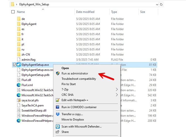 فایل را از حالت فشرده (ZIP) خارج کنید و روی فایل ElphyAgentSetup.exe راستکلیک کرده و گزینهی