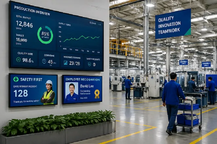 نمایشگرهای دیجیتال در سالن تولید یا محل استراحت کارکنان میتوانند: